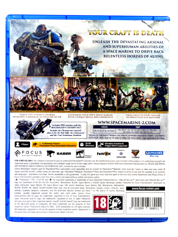 Step into the role of Space Marine Titus and wield unmatched power to annihilate the Tyranid swarms in Warhammer 40,000: Space Marine 2 for PS5. Engage in fast-paced, visceral third-person combat featuring deadly abilities and devastating weaponry. Experience a gripping campaign solo or team up with two friends in intense three-player co-op. This standard edition includes the base game, Macragge’s Chosen DLC, and three exclusive cosmetics for your Bolt Rifle, Chainsword, and Power Armour, delivering a relentless battle to defend the Imperium.